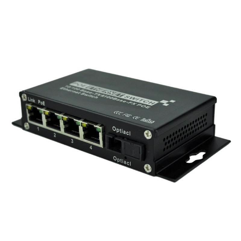 Single Fiber 10/100M PoE Media Converter, 1-port Fiber & 4-port RJ45, Tx:1550nm/Rx:1490nm, Singlemode, 80km