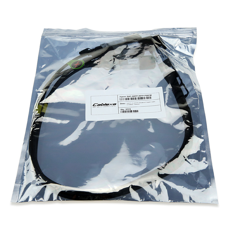 Cablexa has this QSFP+ to 4 SFP+ Breakout Copper Cable, 0.5 Meter, Passive - DAC-QSFP-4SFP-P50CM in stock and ready to ship. This cable is tested for 100% functionality and guaranteed compatible for outstanding network performance. Now you have a reliable, compatible and affordable means to expand your network while maintaining its integrity.