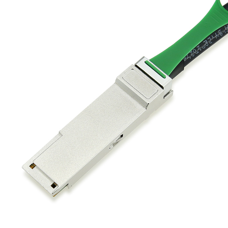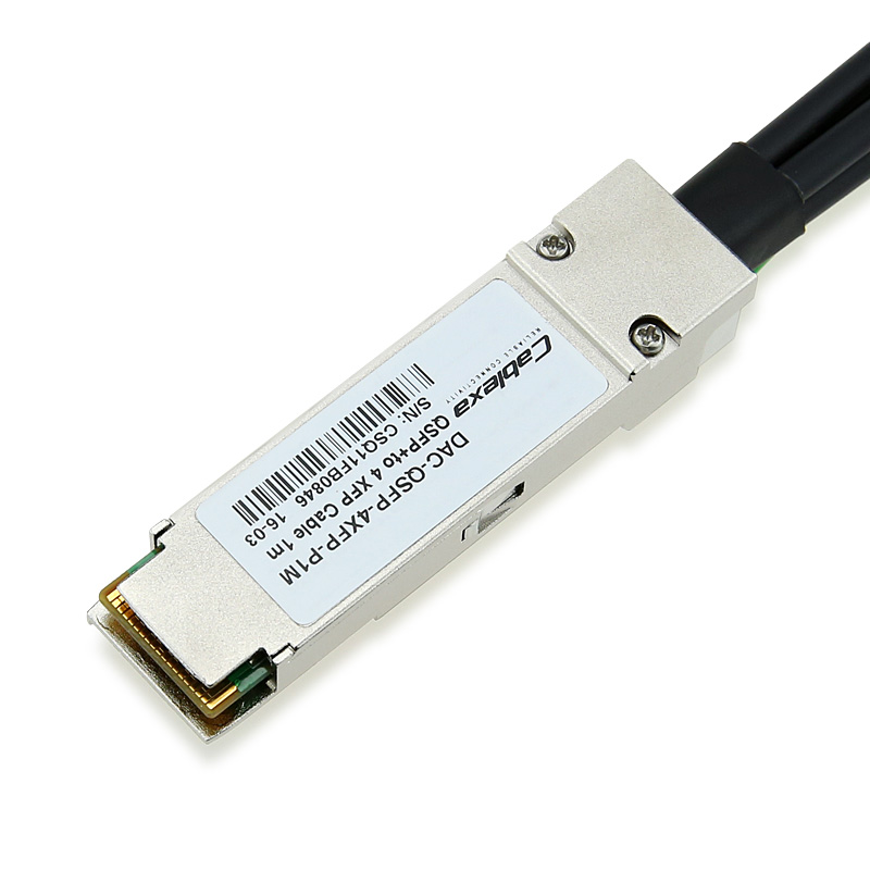 The QSFP+ to 4x XFP+ copper DAC cable is a 40GBase QSFP+ hybrid passive cable. A side is a QSFP+ connector, B side is 4 XFP+ connectors. It’s an application for link with QSFP+ port on 40Gb/s rate switch or host and feed up to 4 upstream 10Gb/s switch or host.
